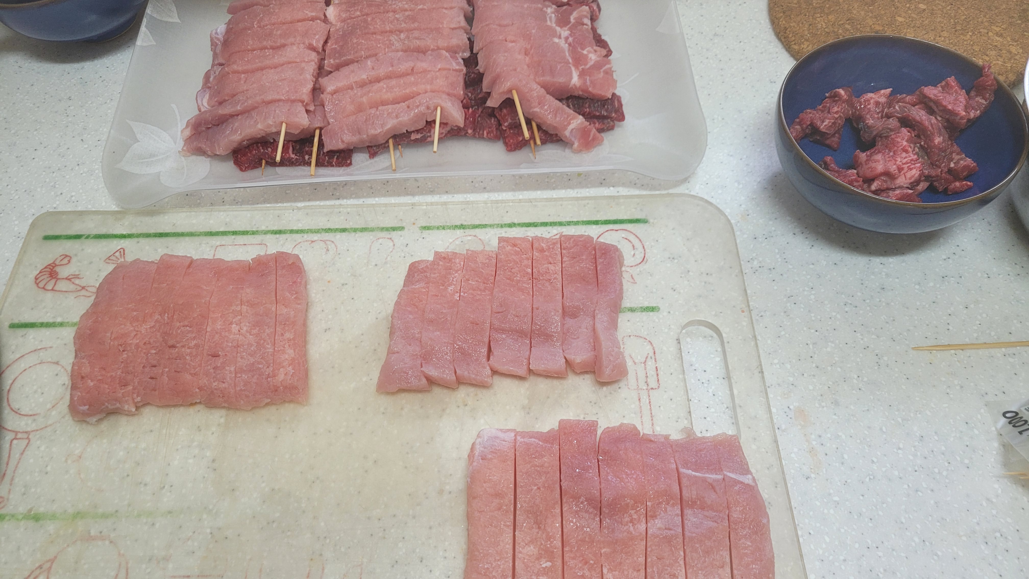 소고기랑 돼지고기 꼬지 만들었어